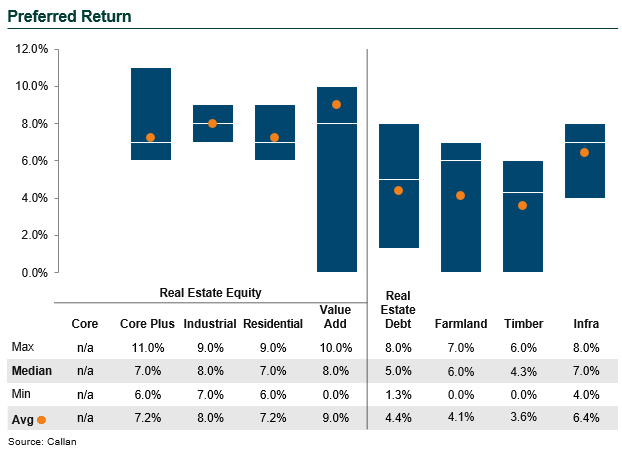 - The median preferred return across all strategies charging a performance fee was 7%. (Core real estate equity funds were excluded, as only four funds have performance fees.)