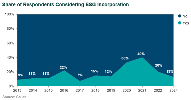 - Allocation: Only 13% of respondents that incorporated ESG maintained an ESG allocation separate from their main portfolio, down from 26% in 2022, indicating broader integration is preferred.
